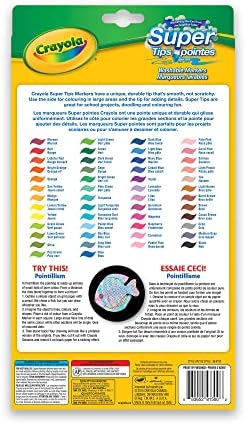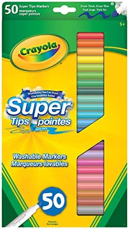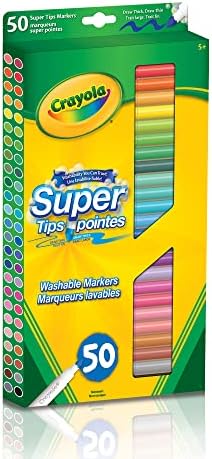 View larger View larger Versatile Tip Create vibrant, colourful drawings, designs, and written messages with Crayola SuperTips Markers. This pack contains 50 markers. Each marker has a durable tip, can create a thick or thin line, and won’t bleed through paper. Durable Tips For Drawing And Writing SuperTips Markers feature a versatile tip that lets you create thick or thin lines and works well for drawing, colouring, and writing. These tips will remain sharp and firm, even after hours of drawing. Vibrant, Non-Bleeding, Washable Colours These markers are vibrant and colourful yet won’t bleed through most paper, so your origil designs look crisp and sharp with no blurred edges. Even after the caps have been removed for 24 hours, the ink will remain fluid and smooth. Prematurely dried markers can be revived by dipping the tips in warm water for a minute or two. Cleanup is no problem with SuperTips Markers. They easily wash off skin and fabric, so they won’t stain hands and clothing. What’s Included One Vinyl Storage Pouch 50 SuperTips Washable Markers