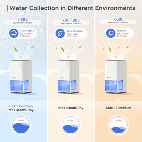【Upgraded Powerful Dehumidifiers】Still annoyed about the Wet Room, Moisture closet, Damp Floor? The dehumidification performance of upgraded 50% more than others with semiconductor refrigeration and powerful suction fan. Max collect 14 OZ (400ml) of water per day (at 86°F, 80% RH ). Ideal for spaces 50-320 sq ft.