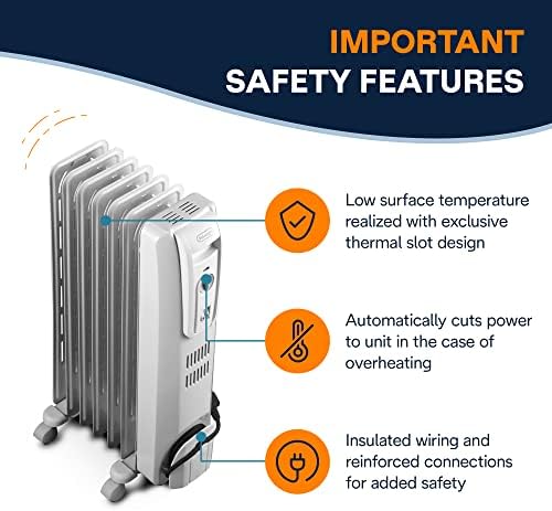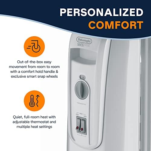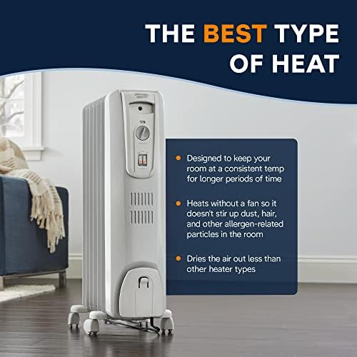Indulge in the quiet, all-embracing heat of the 1500-watt TRH0715CA De’Longhi radiant heater. With an exclusive thermal slot design, this oil-filled radiator heater maximizes heat flow while maintaining low surface temperature. Beyond comfort, it delivers a better heating experience with your wellness in mind: unlike other portable heaters, the TRH0715CA minimizes dry air and won’t stir up dust, hair, or other allergens. Built-in safety features include a thermal cut-off and anti-freeze setting.