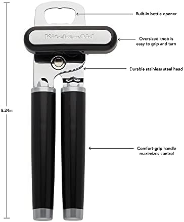 The KitchenAid can opener is an essential gadget for any kitchen. The can opener’s large, easy-to-turn knob makes opening cans an easy task. The can opener features a sharp, 420 J2 stainless steel cutting wheel and an integrated bottle opener built into the head. This can opener is durable and comes with ergonomic handles to provide a sure grip when in use. It has glossy ABS handles, ABS satin chrome plated bolsters and endcaps, as well as an ABS satin chrome plated badge. Hand wash with warm water and a mild detergent, Rinse and dry immediately. One year hassle-free replacement and lifetime limited.