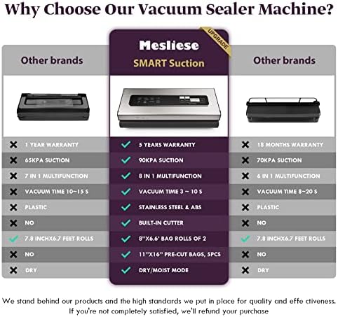 【5 Year Warranty and Satisfied Service】You will receive 1x vacuum sealing machine, 2x vacuum rolls (8″x6.6′), 5x pre-cut bags (BPA free, 11″x16″), 1x user manual, 1x Air suction hose, 1x AC power cable, 2x sealing sponge/gaskets. Mesliese offers 5-year warranty with refund/replacement available. We’ll be pleased to help you with any issue.